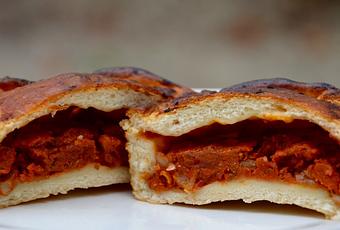 Piquer le dessus de la tielle de 2 ou 3 coups de couteaux ( pour chasser l'air et permettre à la sauce de s'échapper pour colorer la tielle de sa belle couleur orangée).