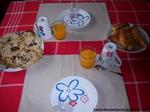J'ai fait du jus d'orange maison, cuit des croissans et petits pains au chocolat (surgelés) et préparé des pancakes aux pépites de chocolat.