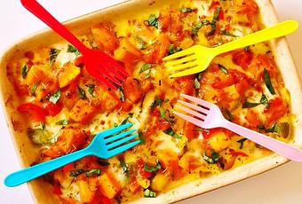 Dans un petit plat à four rectangulaire, on dépose les morceaux de potimarron et de poivron, puis on les recouvre de 125 g de mozzarella tranchée en lamelles.