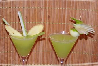 3 pommes grany - 1 branche de céleri de 15cm de long - 2cm de racine de gingembre - 2 c à s de jus de citron - 8cl de crème de gingembre - 4 cl de gin - 12cl de jus