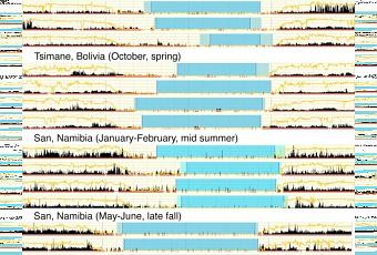 Faut-il oublier le principe des 8 heures de sommeil par nuit et ne dormir que 6 à 7 heures, comme ces chasseurs des 3 tribus étudiées, » Hadza » (nord de la Tanzanie), » San » (Namibie), et » Tsimane » (Bolivie) suivies ici durant 6 à 28 jours. Les chercheurs montrent que,