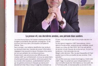 Le plus grand magazine LGBT francophone, connu dans le monde entier, respecté de ses confrères, aurait disparu au milieu de l'été 2015. Qu'il me soit permis de penser à toute l'équipe de ce journal qui, du jour au lendemain, s'est retrouvée à la rue.