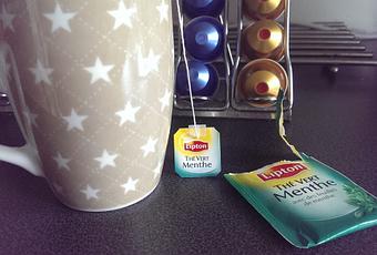 Le midi, un Nespresso (What else ?) après manger. L’après-midi, re-cappuccino ou thé vert à la menthe. Avec des biscuits de préférence ! Je n’aime pas trop le thé nature mais tous les autres aromatisés, j’adore. Parfois un chocolat chaud, parce que c’est miam, mais c’est bien plus rare, je trouve que ça fait à boire et à manger, ça me cale direct. Je réserve ça donc pour mon Petit Monsieur qui ne mange rien le matin, au moins ça lui remplit un brin le bidon.