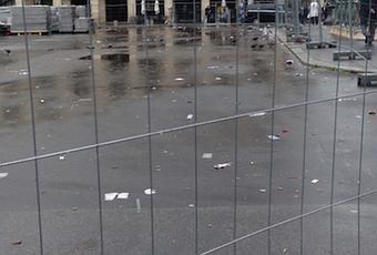 Située entre le Conseil d’État, monument classé, et le Louvre, monument classé, cette place parisienne est désormais transformée régulièrement en showroom pour différentes marques ou pour la promotion de régions ou de pays, qui se succèdent à un rythme régulier. Début septembre, c’était l’Azerbaïdjan, d’ailleurs pays hautement démocratique, qui venait faire sa publicité en annexant la place. Puis il y a eu encore on ne sait combien de ces foires marketing, au moins une en tout cas car voilà l’état dans lequel la place se trouvait le 6 octobre dernier, après le démontage d’une d’entre elles. Et, actuellement, c’est le Printemps qui fête ses 150 ans avec une « exposition dédiée à l’élégance française1 » : « 66 images tirées des catalogues ou des affiches produites par le grand magasin racontent cette histoire ». Et avec qui l’exposition se fait-elle ? Avec Jean-Claude Decaux, l’un des partenaires les plus actifs de la Mairie de Paris, qui remplit la ville de son mobilier urbain et de ses panneaux publicitaires toujours plus envahissants. Quelle surprise !