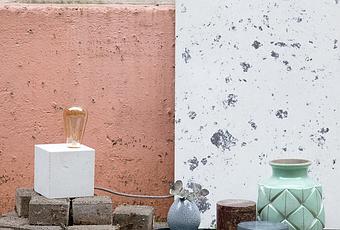 Pour vous présenter nos lampes, ainsi que cette plaque de béton à effet moucheté que nous avons réalisées dans l’atelier des The French Vikings, nous avons décidé de faire un petit shooting en extérieur. Nous avons découvert ce mur décrépi aux couleurs passées et ça nous a inspiré pour jouer sur les différents contrastes de matières et de formes pour créer une image graphique. Nous voulions donner vie à cette lampe dans une nature morte aux teintes douces et profondes.