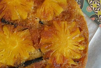 Préparez votre caramel à sec (sucre et vanille). Disposez les rondelles d’ananas sur le dessus, rapez votre gingembre et réservez le temps de préparer l’appareil à gâteau.