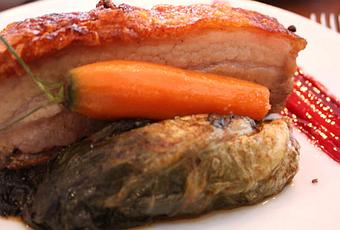 Poitrine de porc fermier, crème de maïs doux, laitue braisée. Damned, quelle superbe pièce ! Cuisson parfaite, tendre et grillotée sur le dessus, qualité impeccable, une laitue et une carotte entière pour agrémenter l’ensemble et une petite crème de maïs doux un peu sèche cependant.