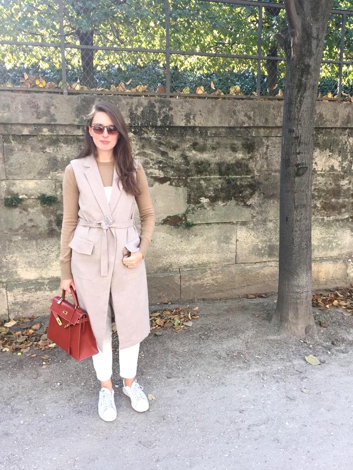 Ce que je fais toutefois de plus en plus, c'est oser les teintes claires une fois l'été passé. Je trouve que surtout à l'automne, les dégradés de beige, camel et blanc s'harmonisent joliment aux lumières et aux feuilles de la saison tout comme il n'y a rien de plus agréable qu'un blanc éclatant se distinguant lors d'une grise journée d'hiver. Ici, seul mon sac couleur brique vient rompre la monochromie de ma tenue.