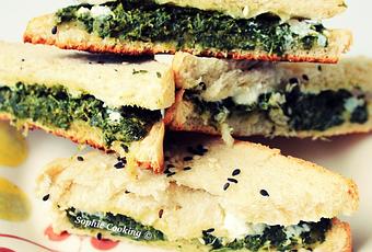 6 tranches de pain de mie si possible complet - 200 g d'épinards frais - 100 g de faisselle de chèvre - graine de sésame - sel & poivre.