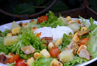 Repartir par dessus les croutons, les dès de pommes de terre, les quenelles, les tomates cerises coupées en 2.
