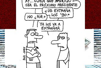 L'homme aux bras croisés : Ouais ! Pourvu que Mauricio [Macri] soit le prochain président... L'autre en face : Pourquoi ? Vous avez la nostalgie des années 90 ? (1) L'homme aux bras croisés : Non. Pour quelle raison... L'autre en face : Ben, dans ce cas-là, vous allez l'avoir ! (Traduction © Denise Anne Clavilier)