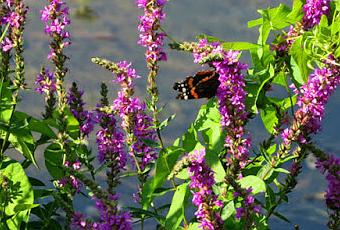 Lythrum salicaria (Salicaire commune) : herbacée vivace à tige dressée quadrangulaire, feuilles opposées ou verticillées par 3, allongées-aiguës, verticilles de fleurs à 6 pétales froissés rose-violacé groupées en épi dense terminal. Commune dans les prairies humides, aux bords des eaux et dans les fossés.