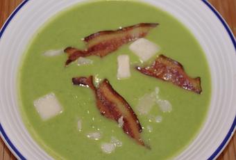 Répartissez le velouté de petits pois dans des bols ou assiettes creuses. Parsemez de cheddar et garnissez de tranches de lard coupées en deux.