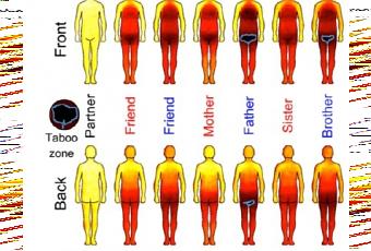 Les cartes : (Cliquer ci-contre) Chaque chiffre correspond à une relation différente pour les répondants. Les zones rouges et bleues pour la relation correspondent respectivement aux femmes et aux hommes. Le bleu délimite les zones taboues, les couleurs claires indiquent une plus grande acceptabilité d’être touché.