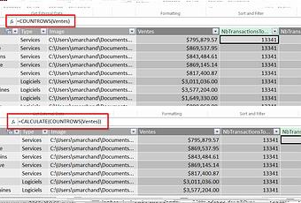 Dans l’article Power Pivot: Leçon de DAX no.3 (COUNTROWS), nous avons vu comment utiliser la fonction DAX COUNTROWS. Dans le premier exemple, ci-bas, nous l’utilisons notamment pour calculer le nombre de transactions total dans la table de ventes et le résultat est inscrit dans une colonne de la table Catégories. Ainsi, pour chaque catégorie, nous obtenons un nombre de 13,341 transactions. Ce chiffre est stable puisqu’il représente le nombre de transactions total, sans égard aux catégories, dans la table de ventes. Dans le deuxième exemple ci-bas, nous affichons plutôt le nombre de transactions par catégorie, par le biais de la fonction CALCULATE. Nous déplaçons ainsi le contexte de lignes en contexte de filtres.