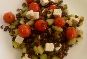 Dans un saladier, mettre les lentilles, le concombre, les tomates, la feta, la menthe.