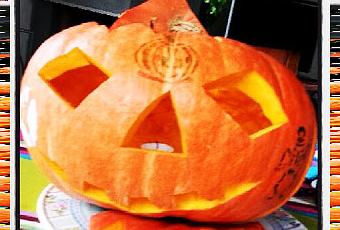 Pour la découpe il faut un adulte parce que c'est loin d'être facile. On trace les contours au crayon de bois puis on taille. il y a des gabarits sur le net qui peuveney aider. Ensuite les enfants l'ont décoré de jolis dessins squelettes et araignées avec l'aide de pochoirs. Pour l'illuminer, il suffit d'une bougie chauffe-plat.