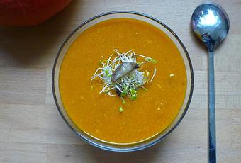 Rien de bien compliqué dans ce petit velouté, mais des saveurs boisées qui s'harmonisent bien. Une petite soupe bien réconfortante, pour me consoler de mes mésaventures... Et oui parce que pas même arrivée au pays des Germains, j'ai eu un accident de vélo. Et un beau (en plus, c'était même pas ma faute)! J'ai eu droit à la totale : ambulance, urgences, fracture de la pommette, opération et tutti quanti. Afin, tout est bien qui finit bien, si ce n'est que j'ai écopé d'une interdiction de mastiquer pour six semaines. Adieu tartines de pain noir et salade de chou rouge, bonjour soupes et purées (heureusement, la saiaon s´y prete)! D'où la petite soupe d'aujourd'hui...