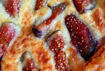 Une tarte fine avec une pâte feuilletée, une créme d'amande express, des figues et le goûter où le dessert est prêt.