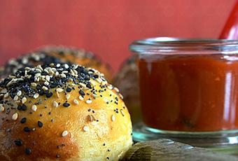 Pour les pains : 1 kg de farine - 30 g de levure fraiche - 20 g de sel - 50 g de sucre - 40 cl d'eau tiède - 15 cl de lait tiède - 2 oeufs - 60 g de beurre mou - 2 jaunes d'oeuf pour dorer - Des graines de sésame noir et doré, pavot bleu.