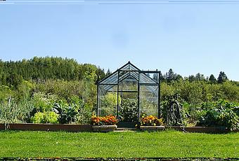 Notre serre avec deux de nos sections du potager. Il manque la section à l'arrière de la serre.