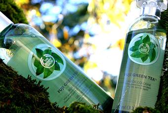 C’est cet été, en flânant rue Sainte-Catherine à Bordeaux, que j’ai craqué sur une partie de la gamme Fuji Green Tea. Je baguenaudais dans le magasin, en faisant sentir tous les beurres corporels à ma nièce qui voulait deviner de quel parfum il s’agissait (et se plantait allègrement à chaque fois), quand soudain j’avisai (tu noteras, lecteur, l’usage du passé simple) cette gamme fort avenante, d’un beau vert d’eau. Gel douche, beurre corporel, infusion pour le bain, gommage pour le corps, eau de cologne…Il y a en tout 9 produits dans cette gamme.