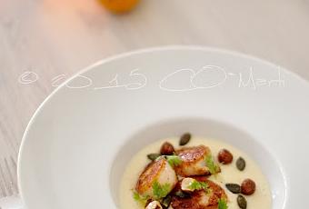 Éplucher les panais, retirer la partie centrale qui est dure et fibreuse, découper en morceaux. Dans une casserole, faire chauffer une noix de beurre, y faire revenir le panais pendant 1-2min, puis mouiller avec le bouillon. Laisser cuire pendant env. 10min (selon la taille des morceaux de panais) jusqu’à cuisson complète. Passer le tout dans un blender, ajouter la crème et le bouillon de légumes (selon ce qu’il restait après cuisson) pour obtenir une crème lisse, assez épaisse. Saler et poivrer. Réserver. Faire dorer à sec dans une poêle les graines de courge et les noisettes. Réserver pour la suite. Commencer par gentiment réchauffer la crème de panais. Pour les Saint-Jacques, c’est au dernier moment : les rincer rapidement sous l’eau, sécher dans du papier absorbe-tout. Saler, poivrer et assaisonner avec du piment d’Espelette, puis faire revenir 1min sur chaque face dans une poêle avec de l’huile bien chaude. Elles doivent être bien dorées à l’extérieur, mais pas trop cuites à l’intérieur. Dresser l’assiette avec la crème de panais, les Saint-Jacques au centre, les graines de courges, les noisettes. Quelques peluches de cerfeuil, une tombée d’huile de noix, puis quelques gouttes de crème de vinaigre balsamique et le tour est joué. Ne reste plus qu’à déguster ! Bon week-endCopyright ©: Mes photos et mes textes sont protégés par un contrat Creative Commons. Merci de lire les conditions et de les respecter !