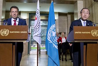 Peter Maurer et Ban Ki-Moon le 30 octobre dernier à Genève lors de l'appel conjoint CICR - nations unies pour un meilleur respect du Droit international humanitaire . UN Photo/Jean-Marc Ferré