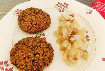Voilà un plat complet (composé de légumes, céréales, légumineuses, oléagineux, fruits) au mariage des saveurs (piquant du radis, acidité de la pomme et du vinaigre de cidre, douceur du pâtisson, amertume des noix encore jeunes) parfait !