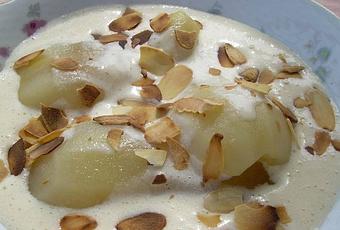 Pour 6 personnes : 60cl de bière blanche - 310g de sucre - 6 poires - le jus d'un citron - 25cl de lait - 40cl de crème liquide - 120g d'amandes en poudre - 1 gousse de vanille - 2 oeufs frais + 1 blanc - 2 c à s de maïzena - 120g d'amandes effilées grillées - sel