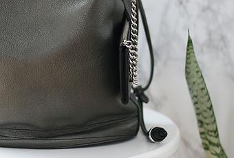 Pourquoi je l’aime ? Déjà, pour sa forme seau moderne et revisitée, que l’on peut porter aussi bien en bandoulière qu’à la main. Ensuite, pour son cuir grainé sublime, au coloris foufou entre le gris plomb et le bronze. Pour son accessoire moderne et rock, la petite pochette zippée qui se glisse dans la « poche » du sac.