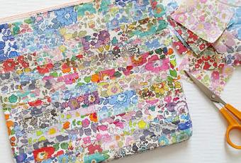 J'avoue que cette technique m'a intriguée de prime abord : le nom du projet est DIY Laminate Liberty Scrap Pouch et je me demandais comment les petits bouts de Liberty pouvaient bien tenir ensemble. Après investigation très poussée de ma part, la technique est la suivante : vous collez plein de petits carrés ou rectangles de tissu sur un support textile (un simple coton par exemple) avec de la colle à bâtir par exemple puis de poser par dessus du vinyle avec le fer à repasser. La pochette est alors un peu plus difficile à coudre (du fait que le tissu est plastifié) mais le résultat est vraiment chouette.