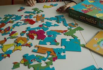 Le lutin a repris le puzzle du monde. Pour l'instant, il n'est pas rapide et pas organisé. Il fonctionne au hasard, avec le temps au cadre et pas encore aux pays dont nous connaissons le continent. Ce sera peu à peu son défi... estimer le continent et après faire par pays limitrophes.