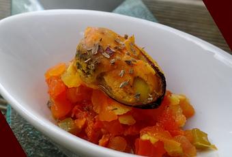 Une mini ratatouille avec des petits cubes de chorizo dans les cuillères et par dessus on rajoute une moule, c'est délicieux.