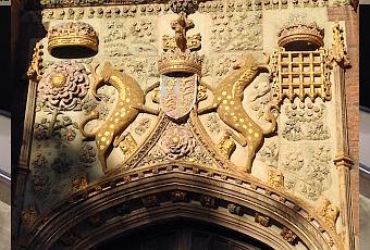 Ci-dessous, le détail particulier de la façade donnant sur St John's Street. On peut voir les emblèmes du collège représentés par la rose rouge de Lancaster et la herse. Les armes du College sont entourées de créatures connues sous le nom de Eale, des animaux mythiques avec un corps d'antilope, une queue d'éléphant, une tête de chèvre et des cornes.
