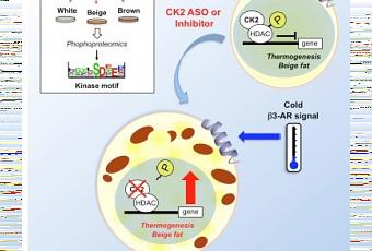 Dans la nouvelle étude, les chercheurs ont étudié, par phosphoprotéomique, les différences de processus par lesquels les cellules adipeuses blanches et brunes répondent au froid. Ils identifient ainsi une protéine appelée caséine kinase 2 (CK2), qui semble responsable de la prévention de la combustion de la graisse blanche. Lorsque cette protéine est génétiquement ou pharmacologiquement inhibée, alors les cellules adipeuses blanches se mettent aussi à la combustion, comme leurs homologues brunes. L’activité de CK2 est accrue chez les souris obèses.