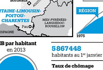 Sur le papier, la région Aquitaine-Limousin-Poitou-Charentes fait une jolie mariée, ses trois présidents vantant son palmarès : première puissance agricole nationale, première région viticole… Pour autant, la plus vaste des treize nouvelles entités cache de profondes disparités sociales (les très bas salaires du Limousin), de peuplement (un habitant sur cinq du futur ensemble résidera dans l’ère urbaine de Bordeaux), économiques (le PIB de l’Aquitaine est presque neuf fois supérieur à celui du Limousin). Créditée de 46 % des voix au second tour, la liste socialiste conduite par Alain Rousset est favorite, d’autant qu’il est le sortant en Aquitaine et que le PS dirige le Poitou-Charentes depuis 2004 et le Limousin depuis toujours. Dans l’arrière-pays, il incarne plus la capitale, Bordeaux, qu’Alain Juppé.
