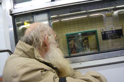 Et voici qu'approche un compagnon de rame : une barbe blanche interminable jaunie par la nicotine, un regard perdu dans le vide derrière une vieille paire de lunettes et cette odeur si particulière qui l'accompagne, savant dosage de transpiration, de vêtements sales, d'alcool et de tabac froid. Il s'assoit, colle son visage à la vitre et ne bouge plus. Il ne semble même plus parmi nous.