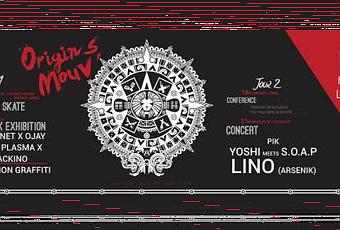 1er édition du festival « Origin’s Mouv » à La Rochelle, rassemblant les différentes branches de la culture Hip Hop. Au programme un contest de skate, un contest de graffiti accompagné de Djs, une conférence interactive sur « L’insertion de la culture Hip Hop dans la société » par Olivier Cachin et une soirée de clôture en concert avec Pik, Yoshi meets S.O.A.P et LINO…