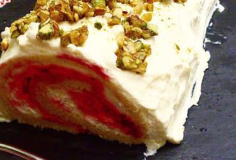 3. Rouler le gâteau à partir du côté le plus court et le déposer sur un plat de service. Couvrir du reste de la crème au mascarpone et au chocolat blanc. Parsemer du reste de la nougatine aux pistaches.