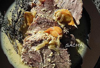 En fin de cuisson , découper le rôti en tranches , l'arroser du jus de cuisson