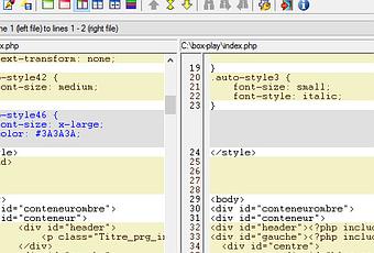 Ce programme compare deux fichiers et examine leurs différences, ajouts, suppressions ou simples modifications, puis vous y donne accès visuellement par un code de couleur. L'interface est bien faite et donne un accès rapide aux modifications, qui sont clairement mises en valeur. Tout est configurable, et il est possible d'appeller le bloc notes pour éditer un des fichiers. Cette version est gratuite. Une version pro (35$) est disponible et ajoute la comparaison de dossiers et fichiers binaires, et surtout l'édition directe...