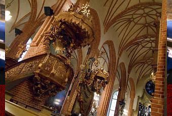 Je commence par la cathédrale. Sur cette photo, on voit à la fois les jolies colonnes de brique (on a enlevé le plâtre qui les recouvrait il y a une centaine d'années), les ogives du plafond, la chaire (avant-plan à gauche; un peu extravagante, non?) ainsi qu'un des deux bancs réservés à la présence royale (au centre; lui aussi assez extravagant merci).