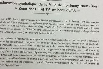 En Bureau Municipal puis en Commission des Finances. J'y présente une note pour placer notre ville hors zone TAFTA et hors CETA. En commission des Finance il s'agit de la préparation du point 33 de notre prochain Conseil Municipal. Je suis fier d'avoir travaillé ce dossier avec mon collègue Régis Pio et d'inscrire notre ville dans le grand mouvement européen des collectivités territoriales qui luttent contre ce projet d'accord de libre-échange et d'investissement qui vise à libéraliser encore davantage les échanges commerciaux entre les États-Unis et l'Union Européenne en démantelant les droits de douanes et en s'attaquant aux normes et régulations. C'est un accord d`allégeance des économies européennes au profit des multinationales. En outre il est a signaler qu'aucune consultation des pelés n'a eu lieu. Nous sommes tenus à l'écart des discussions qui se déroulent dans la plus stricte confidentialité entre une poignée de négociateurs, experts non-élus et lobbystes des grands groupes économiques.