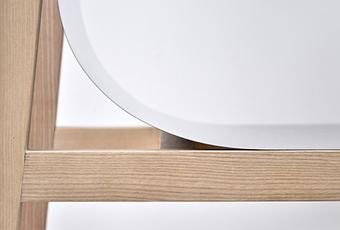 Mêlant acier brossé et frêne massif, la chaise se monte facilement grâce aux tourillons renforcés par des aimants, on vient ensuite fixer la plaque de métal qui se courbera et s'aimantera également à la structure, dessinant une assise confortable.