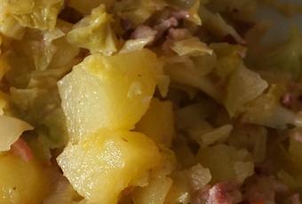 - Dans une cocotte (de préférence en fonte, ou une bonne mijoteuse) faire chauffer l'Huile d'Olive, y faire rissoler l'Oignon émincé et les Lardons fumés. Lorsque les Oignons sont translucides, ajouter les Pommes de terre, les lanières de Chou. Arroser du Vin blanc et de l'Eau. Saler et Poivrer à convenance.