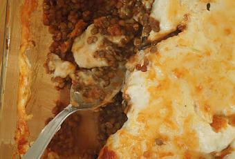 Dans un plat à gratin, verser la moitié du mélange lentilles-tomate. Disposer une couche d'aubergines grillées puis le reste des lentilles, une deuxième couche d'aubergines. Terminer avec la béchamel et un peu de gruyère râpé. Cuire 30 minutes à 170°. Faire dorer le dessus avant de servir.