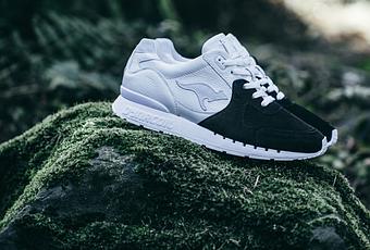 Pour construire l’upper le choix c’est porté sur des matériaux de qualités, cuir scandinave, nubuck perforé italien et suède allemand avec un assemblage qui l’ai tout autant et pouvant se prétendre entièrement fait main dans une usine de cordonnerie allemande. Toute la partie avant est traitée en nubuck noir tout le reste en cuir blanc à cela se rajoute des pièces en suède gris clair comme pour le logo latéral, deux pièces sur le talon dont une accueil le logo du projet, une tête de mouton stylisée, et pour finir la languette affiche une pièce en cuir estampillée des deux marques.