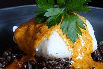 Le poisson cuit, dressez aussitôt les assiettes : quelques cuillérées de lentilles au fond des assiettes creuses, le dos de cabillaud par dessus, avant de le napper de cette superbe et délicieuse sauce orangée. Ajoutez quelques brins de persil plat pour la touche finale et servez.