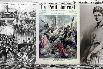 4 mai 1897 : rue Jean Goujon se tient, comme chaque année, une vente de charité organisée par la fine fleur de l’aristocratie parisienne et même internationale au profit des plus démunis. Les stands sont tenus par les plus grands noms. On a créé un décor de rue médiévale, avec en plafond, un immense vélum … Le clou de la manifestation est une démonstration du cinématographe. Une étincelle embrase des vapeurs d’éther, tout s’enflamme en un instant, le feu se propageant immédiatement à l’ensemble de la structure provisoire par le vélum en toile goudronnée. Sur les 1200 personnes présentes, on dénombrera près de 130 victimes, essentiellement des femmes, dont la duchesse d’Alençon, sœur de l’impératrice Sissi, asphyxiées, piétinées devant des issues barrées pour éviter les resquilleurs, prises au piège et carbonisées. Les journaux illustrés donnent de la catastrophe des croquis d’un réalisme saisissant. Ces images me hantent encore aujourd’hui … Un espace clos, un lieu d’insouciance et de plaisir, et tout à coup la mort injuste, absurde et atroce.
